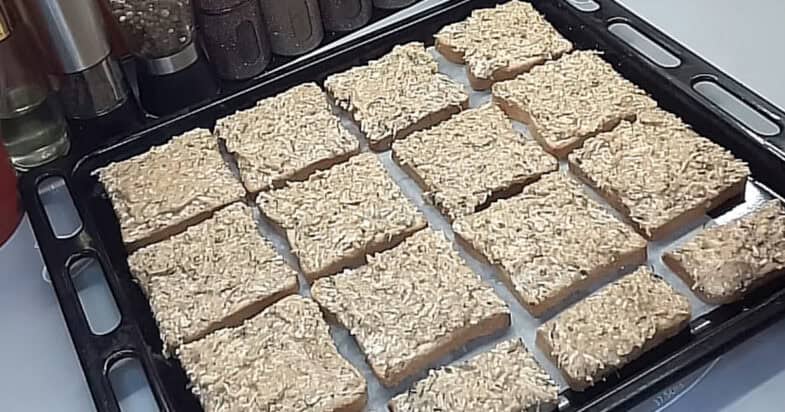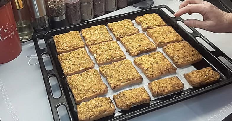 Далі я беру скибочки хліба — можна брати будь-який, який вам подобається. Намазку рівномірно розподіляю по кожному шматочку і викладаю їх на стандартне деко від духовки. У мене вийшло заповнити ціле деко. Духовку я заздалегідь розігріваю до 170–180°C і ставлю бутерброди запікатися приблизно на 15 хвилин. Орієнтуйтеся по своїй духовці. За цей час хліб стає рум’яним і хрустким, а начинка добре прогрівається.