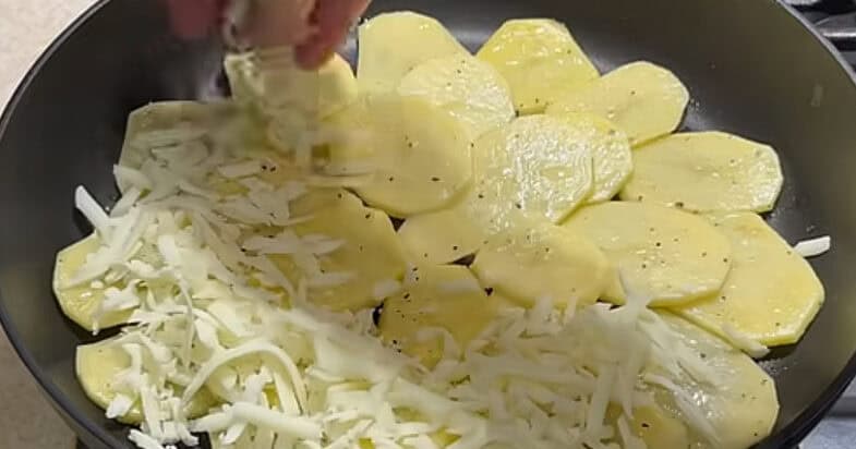 Картоплю нарізаю тонкими пластинками, змішую у мисці з сіллю, перцем та олією. Викладаю шар картоплі у сковорідку на дно. Посипаю тертим на терці сиром моцарелла.