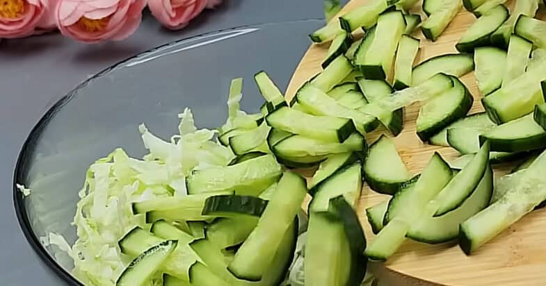 Капусту дрібно шаткую, огірок нарізаю соломкою.