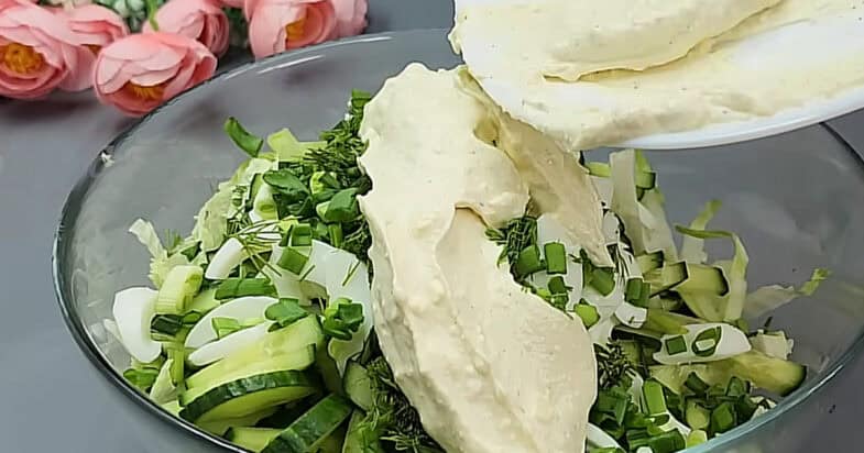 Яйця варені ділю на білки та жовтки, їх залишаю для заправки, а білки нарізаю соломкою, зелену цибулю та кріп нарізаю дрібно. Жовтки подрібнюю виделкою, змішую з сіллю, перцем, олію, гірчицею та сметаною. Заправляю салат.
