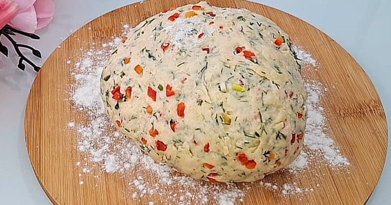 Змішую кефір з розпушувачем. Додаю яйце, цукор, сіль, перемішую. Болгарський перець нарізаю дуже дрібними кубиками, подрібнюю кріп, на терці натираю твердий сир, дуже дрібно нарізаю часник, змішую усе разом. Всипаю борошно, замішую тісто руками.