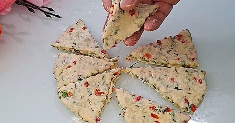 Ділю тісто на 4 шматочки, формую кульки, розкачую коржики, розрізаю на трикутники.
