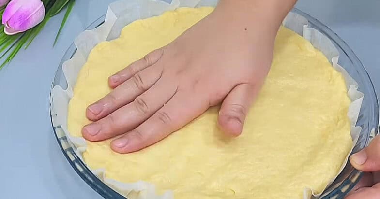 Форму діаметром 26 см застеляю пергаментом, викладаю усе тісто, накриваю харчовою плівкою та залишаю на 20 хвилин.