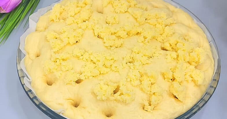 Змішую в окремій мисочці цукор та вершко масло до крихти. Тепер коли тісто піднялось, роблю проколи майже до дна форми, посипаю крихтою. Відправляю у духовку при температурі 180 градусів на 30-35 хвилин. Потім вливаю зверху вершки та ще раз відправляю в духовку на 5 хвилин.