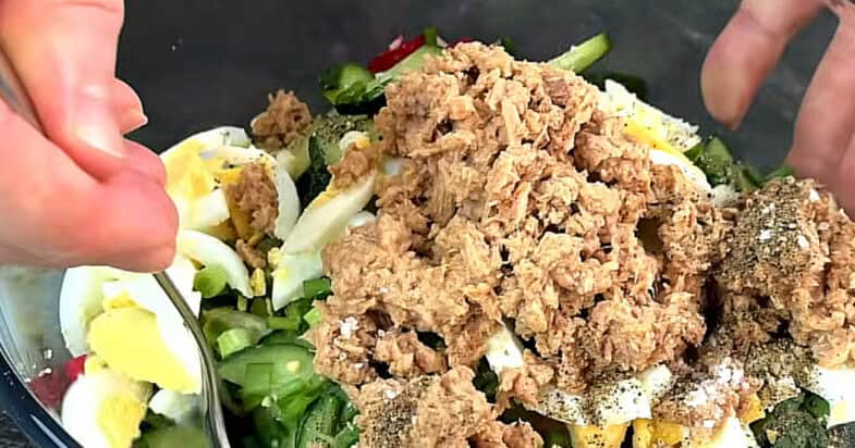 Яйця варені нарізаю смужками. Зелену цибулю нарізаю дрібно. Тунець мну вилкою разом із олією, додаю в салат. Змішую всі інгредієнти, солю та перчу до смаку.