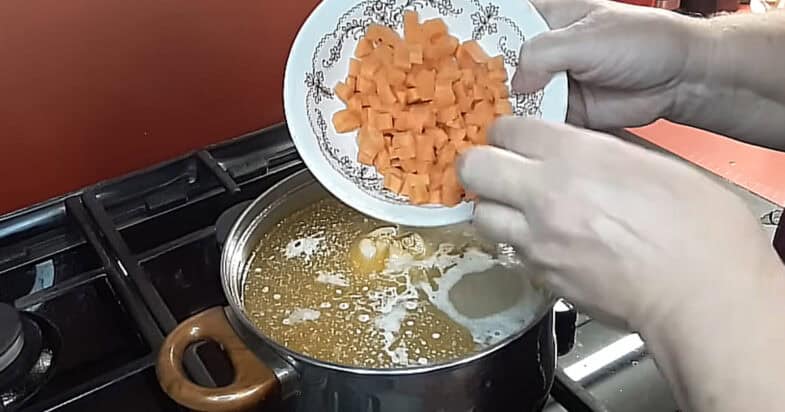 У проціджений бульйон я додаю 2 картоплини, нарізані дрібними кубиками, а ще 2–3 картоплини кладу цілими. Так я роблю для того, щоб суп був більш густий і насичений. Поки картопля вариться, я готую інші овочі. Моркву нарізаю дрібним кубиком, а цибулину розрізаю на 4 частини і також додаю в каструлю. Кладу 2 лаврові листочки і залишаю суп варитися, поки овочі не стануть м’якими. За цей час риба трохи остигає, і я відокремлюю м’ясо від кісток. Коли картопля вже добре зварилася, я дістаю цибулю — вона вже віддала свій аромат і більше не потрібна. Цілі картоплини дістаю, розминаю виделкою, але не до пюре, а так, щоб залишилися невеликі шматочки, і повертаю назад у каструлю.