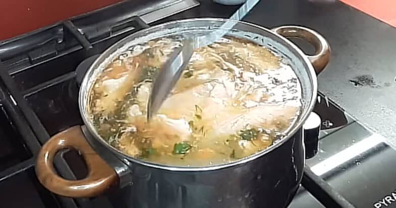 Далі додаю сіль, чорний перець та спеції за смаком. У суп відправляю все підготовлене рибне м’ясо. З такого набору його виходить досить багато — приблизно 1,2–1,3 кг був сам набір, тому суп виходить дуже ситний і наваристий. Лавровий лист я виймаю, пробую бульйон на смак і, якщо потрібно, ще трохи підсолюю. У кухні стоїть такий приємний аромат риби, що одразу хочеться швидше налити суп у тарілку. Наприкінці додаю трохи свіжого кропу та петрушки, смачного!