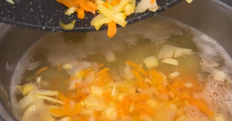 На сковорідці розігріваю олію та обсмажую до прозорості дрібно порізану цибулю. Додаю моркву терту на терці, обсмажую все декілька хвилин. Під кінець додаю дуже дрібно порізаний часник, перемішую ще декілька хвилин.