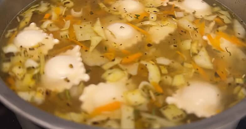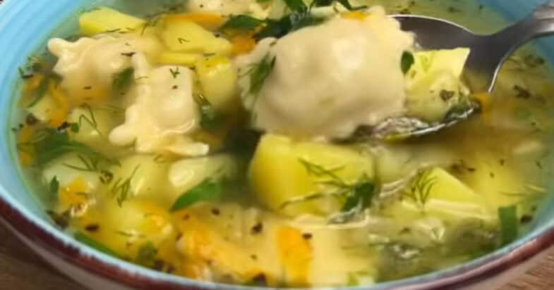Доводжу 2 літри води до кипіння у каструлі. Картоплю нарізаю кубиками, кидаю в каструлю, всипаю сіль, готую 10 хвилин. Тоді додаю засмажку, всипаю перець, прованські трави та базилік, перемішую.