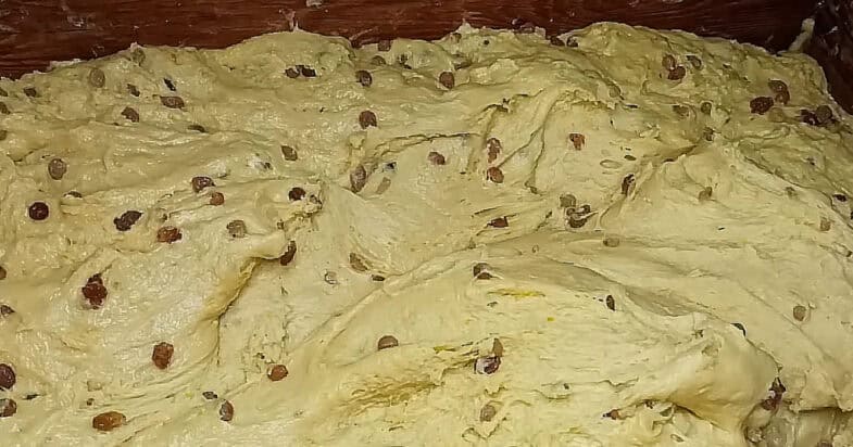 Родзинки промиваю, запарюю, просушую і змішую з борошном. Додаю родзинки до тіста та замішую руками. Накриваю тісто рушником та залишаю відпочити та до збільшення маси удвічі.