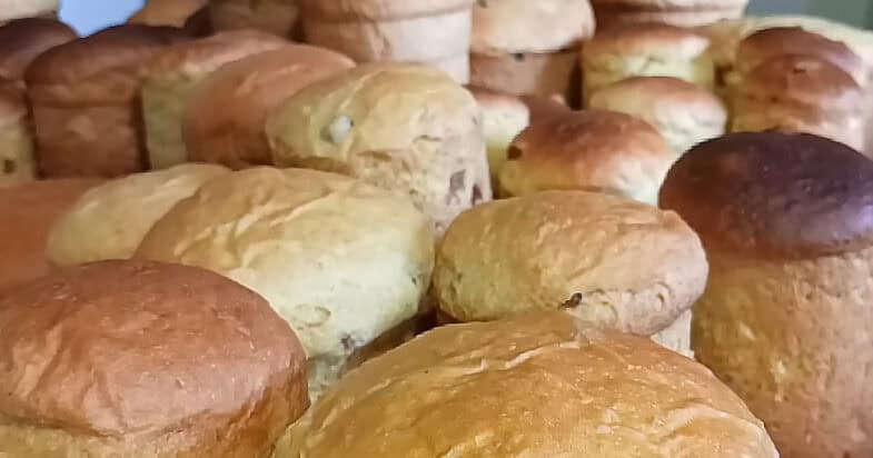 Формочки змащую смальцем, викладаю тісто на 1/3 у формочки. Ховаю родзинки в середину тіста, щоб не пригорали. Накриваю рушником та залишаю відпочити та до збільшення маси удвічі. Великі паски випікаю до півтори години на 180 градусах, а маленькі – 40 хвилин. Якщо паски горять, розказую, що робити: якщо у духовці випікає лише низ – ставлю на низ воду в якійсь ємності. В інших випадках – верх + низ – ідеально. Готовність перевіряю дерев’яною паличкою.