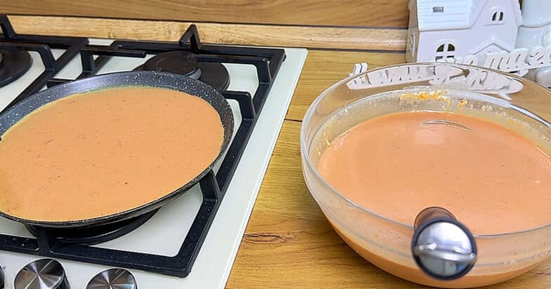 Після цього розігріваю сковорідку для млинців, злегка змащую її олією і починаю смажити печінкові млинці. Смажу їх недовго, щоб вони не стали занадто темними, адже від цього залежить гарний вигляд рулету — мені достатньо приблизно по 2 хвилини з кожного боку. Готові млинці перекладаю на тарілку і залишаю, щоб вони добре охолонули. Із цієї кількості інгредієнтів у мене виходить приблизно 18 млинців.