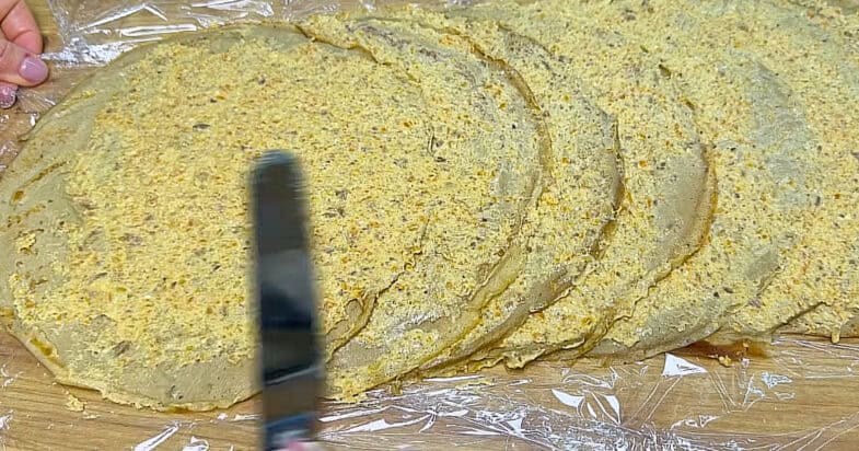Тепер, коли всі інгредієнти готові, починаю формувати рулет. Стіл застеляю харчовою плівкою, викладаю один млинець і розподіляю по ньому повну столову ложку начинки рівним шаром. Зверху кладу наступний млинець і так само змащую начинкою. Таким чином викладаю 9 млинців, після чого підгинаю край і боки та щільно скручую рулет, намагаючись зробити його максимально тугим.