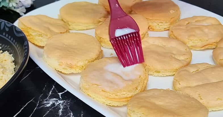 Збиваю яйця міксером з дрібкою солі, ванільним цукром та цукром до пишної та світлої маси. Просіюю борошно і розпушувач, замішую міксером до однорідності. Деко від духовки застеляю пергаментом і викладаю усе тісто. Відправляю у духовку при температурі 180 градусів на 25 хвилин. Потім корж охолоджую і нарізаю формочкою кружечки, з обрізків роблю крихту, якою буду прикрашати десерт. Просочую усі коржики молоком.