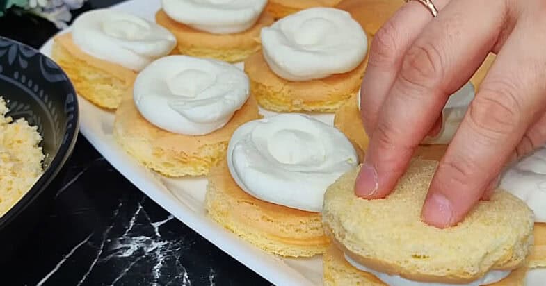 Кладу у миску сир кисломолочний, додаю вершки та цукрову пудру, збиваю міксером до пишної маси. Викладаю крем кондитерським мішком на коржики, прикриваю зверху другим коржиком.