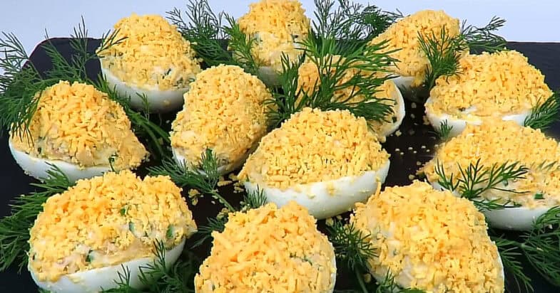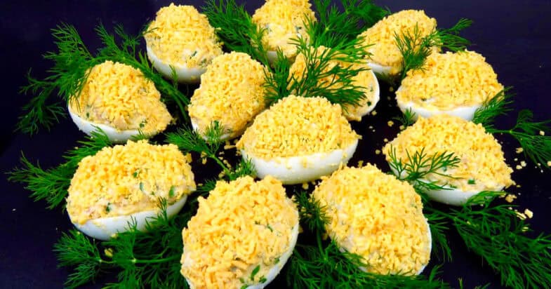 Сьогодні я пропоную приготувати не зовсім звичний варіант — фаршировані яйця «Мімоза». Закуска виходить дуже ефектною, яскравою і без сумніву прикрасить будь-який святковий стіл, а готується вона швидко і просто з доступних інгредієнтів.