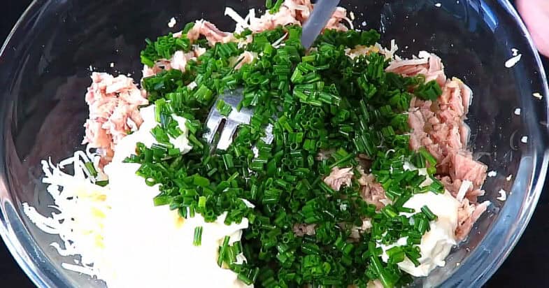 Після цього натираю твердий сир, я використовую чеддер, адже він має приємну пікантність і легку гостроту, яка дуже добре підходить до цієї закуски, але можна взяти і будь-який інший сир за смаком. Далі беру консервований тунець у олії, зливаю з нього олію, а рибу розминаю виделкою і перекладаю до миски з іншими інгредієнтами. Туди ж дрібно нарізаю зелену цибулю, додаю майонез і добре все перемішую. Начинку обов’язково пробую на смак і додаю лише суміш мелених перців — сіль я не додаю, адже тунець і майонез уже достатньо солоні.
