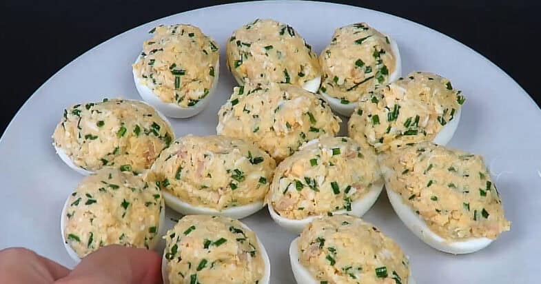 Фаршировані яйця акуратно перекладаю на сервірувальну тарілку, зверху ще трохи присипаю їх тертим жовтком, щоб вони нагадували маленькі квіти мімози. Для завершення викладаю гілочки кропу, які створюють ефект зелених стебел. У результаті виходить дуже красива, ніжна і ароматна закуска, яка обов’язково приверне увагу гостей і стане справжньою окрасою святкового столу. Смачного!