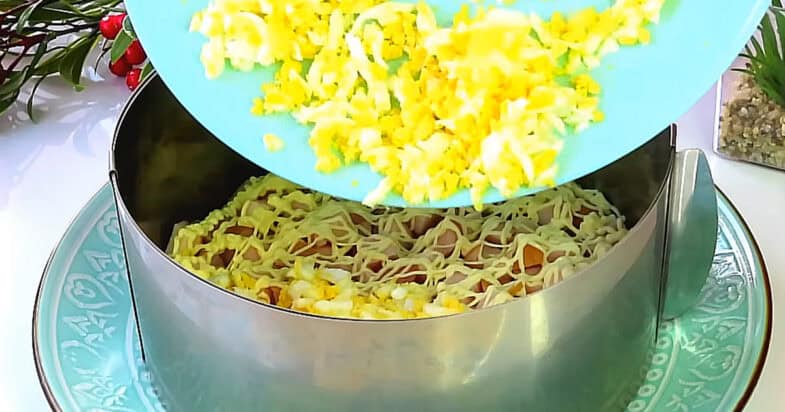 Копчену курку нарізаю кубиками, викладаю у форму, поливаю сіточкою із майонезу. Натираю на терці яйця, поливаю сіточкою із майонезу.