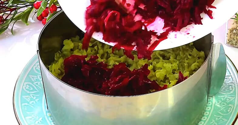Мариновані огірки натираю на терці і також варений буряк натираю, поливаю сіточкою із майонезу.