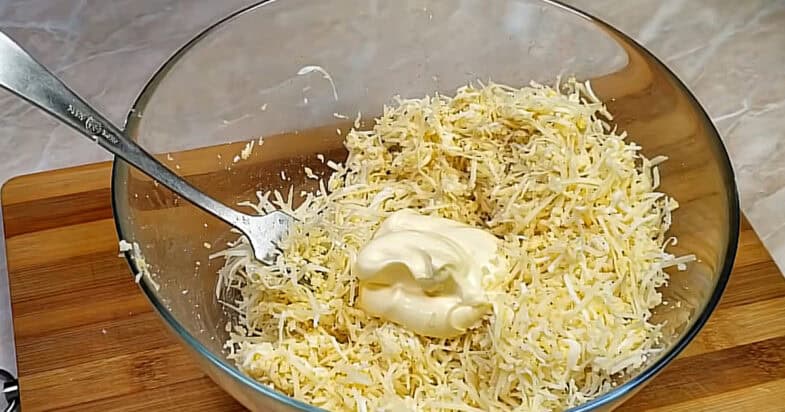 Яйця зварені натираю на дрібній тертці. Потім беру твердий сир і також натираю його на тій самій тертці. Далі додаю зубчики часнику, пропускаю їх через прес. Трохи перчу чорним меленим перцем. Сіль додаю за смаком, орієнтуючись на сир. Спочатку добре перемішую всі сухі інгредієнти, після цього додаю майонез і ще раз ретельно перемішую.
