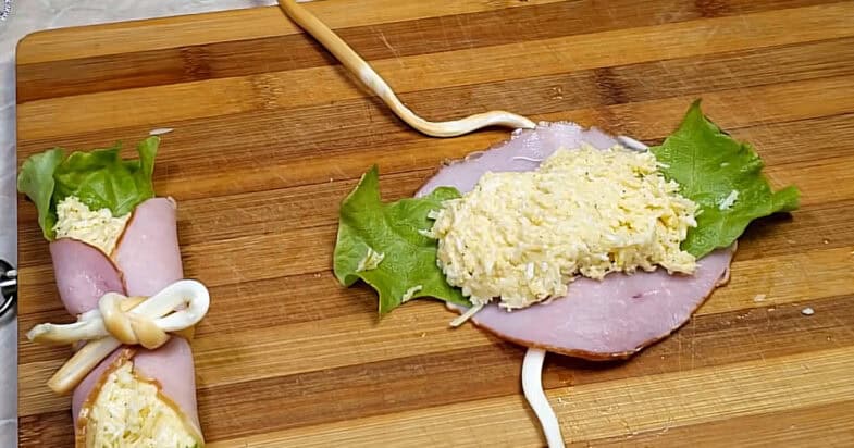 Тепер формую саму закуску. Беру одну нитку сиру косички і намагаюся її акуратно розрівняти. На цю сирну стрічку кладу один шматочок буженини. Зверху відриваю невеликий шматочок листя салату, роблю дві тонкі смужки і викладаю їх так, щоб вони трохи виступали за краї буженини. У центр кладу приблизно 1 столову ложку начинки, так щоб вона трохи притиснула листя салату і зафіксувала його. Після цього акуратно скручую буженину в рулетик, ніби трубочкою, і обв’язую все підготовленою стрічкою з сиру косички. Я зав’язую її у вигляді невеликого бантика.