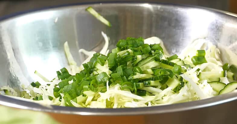 Капусту тоненько нарізаю соломкою, але не довгою, а коротшою. Додаю свіжі огірки, які нарізаю соломкою. Далі дрібно нарізаю зелену цибулю тонкими кільцями і додаю її до овочів. За бажанням сюди також можна додати кріп, петрушку або навіть кінзу.