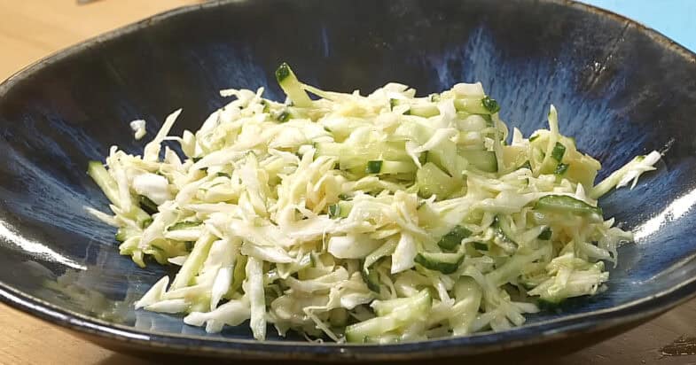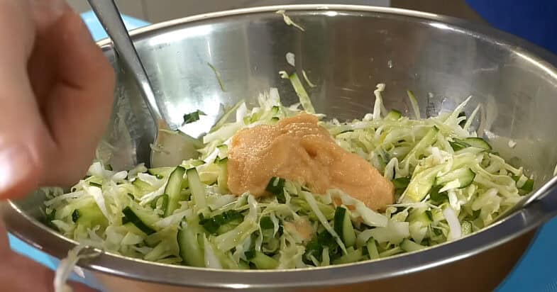 Додаю дрібку солі і збризкую все трохи лимонним соком. Потім вливаю трохи оливкової олії і акуратно перемішую всі інгредієнти. А тепер додаю головний секретний інгредієнт — ікру минтая. Саме вона робить цей простий салат з капусти та огірків зовсім іншим на смак і фактично замінює майонез, надаючи страві ніжності та насиченості.