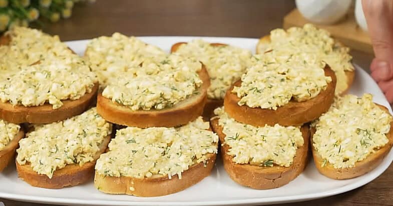 На гарячу сковорідку наливаю олії, викладаю скибочки батона і підсушую їх з одного боку до рум’яної скоринки. Трохи охолоджені скибочки натираю часником. На дрібній тертці натираю варені яйця, дрібно нарізаю пучок кропу і все додаю до миски з сиром. Трохи солю, перчу чорним меленим перцем, додаю мелену паприку та майонез. Все добре перемішую. Начинку рівномірно розподіляю на підсушених скибочках батона.