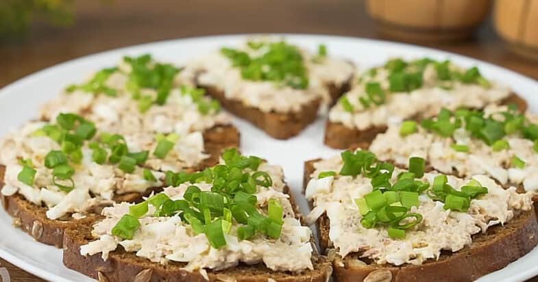 Натираю варені яйця, додаю банку консервованого тунця без рідини і розминаю виделкою. Трохи солю, перчу, додаю майонез і перемішую. Начинку викладаю на скибочки хліба — я використовую житній хліб із насінням. Зверху посипаю дрібно нарізаною зеленою цибулею.