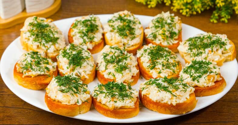 Цибулини нарізаю кубиками і обсмажую на сковорідці з олією до золотистості. Окремо беру рибу, очищаю, мию і нарізаю порційними шматочками. Рибу солю, перчу, обвалюю в борошні і обсмажую на олії до рум’яності з обох боків, після чого викладаю на паперовий рушник. Коли риба охолоне, відділяю її від кісток і нарізаю невеликими шматочками. Додаю обсмажену цибулю, заправляю майонезом і добре перемішую. Скибочки багета підсушую на сковорідці з одного боку, за бажанням трохи натираю часником і викладаю начинку. Зверху посипаю дрібно нарізаним кропом.