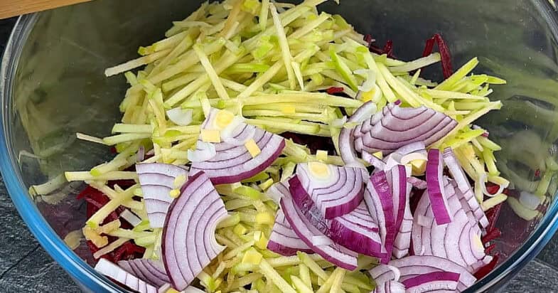 Буряк варений, яблуко натираю на терці. Червону цибулю нарізаю тонкими кільцями.