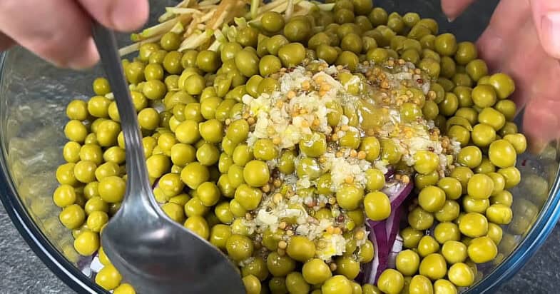 Всипаю горошок, часник видавлюю через прес, додаю олію, лимонний сік, сіль, гірчицю та мед, перемішую.