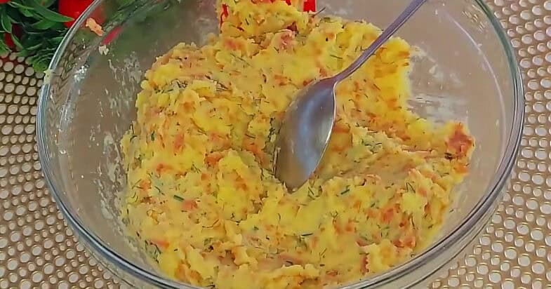 Картоплю очищаю і нарізаю шматочками, відварюю у підсоленій воді до готовності, перетворюю на пюре з шматочком вершкового масла. Додаю сіль, перець, яйце, перемішую. Натираю на терці ковбасу, подрібнюю кріп, перемішую. Додаю борошно, перемішую.