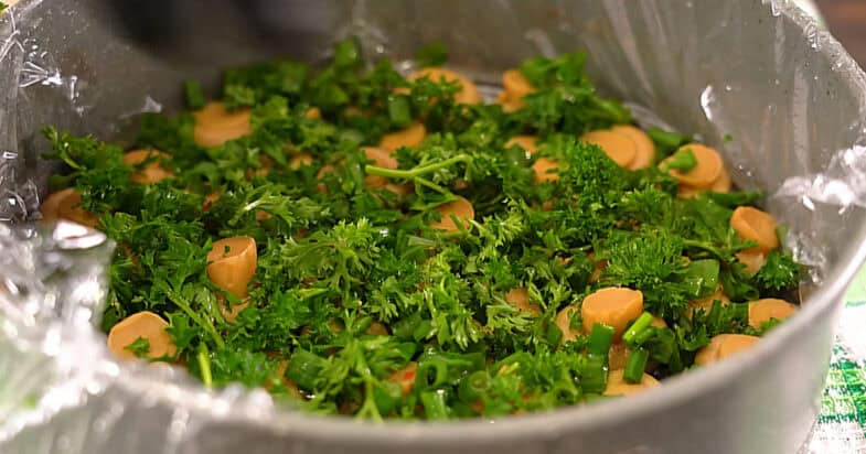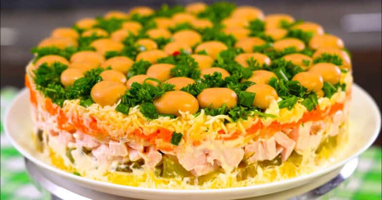 Коли салат просочився, обережно знімаю форму та плівку, зверху додаю трохи кучерявої петрушки. У результаті виходить дуже красивий, святковий салат!