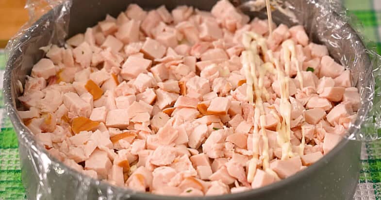 Далі на дрібній тертці натираю сир, розподіляю шар і додаю трохи майонезу. Потім натираю моркву, і знову роблю легкий шар майонезу. Цибулю я вже добре відтиснула від води, викладаю її рівним шаром, трохи солю та додаю чорний мелений перець. Наступним шаром буде курку сьогодні використовую копчену грудку. Нарізаю невеликими кубиками і викладаю зверху. Далі огірки також нарізаю маленькими шматочками та розподіляю по салату, зверху знову додаю майонез.