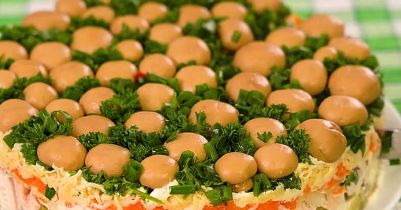 Салат я збираю у роз’ємній формі для випічки 22 см, дно вистилаю харчовою плівкою. Першим шаром викладаю мариновані гриби, щільно, але залишаю невеликі проміжки. Потім дрібно нарізаю зелень — зелену цибулю, петрушку і трохи щавлю та посипаю між грибами. Зверху роблю тонку сіточку з майонезу.