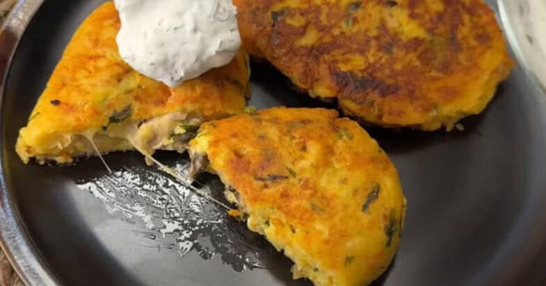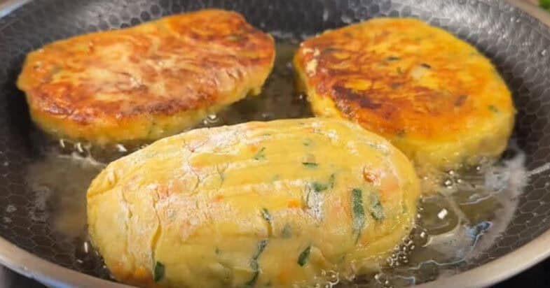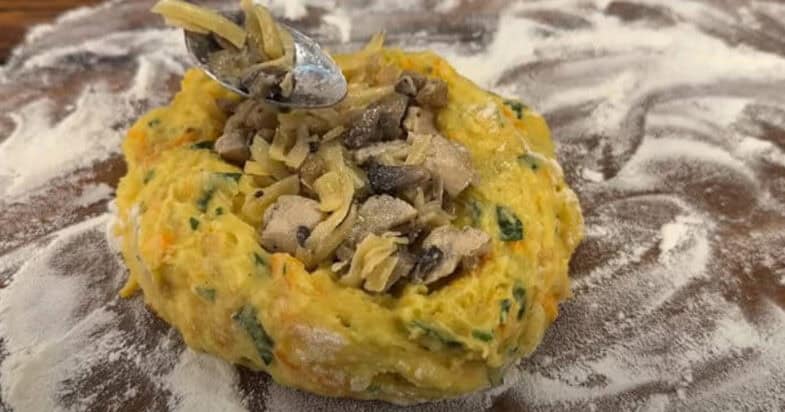 Нарізаю дрібно цибульку, моркву натираю на терці, розігріваю вершкове масло на сковорідці та обсмажую цибулю до прозорості. Додаю моркву, обсмажую, солю і перчу. Картоплю відварюю до готовності у підсоленій воді, перетворюю у пюре. Додаю до картоплі засмажку, петрушку, розбиваю яйця, перемішую. Всипаю борошно, замішую тісто.