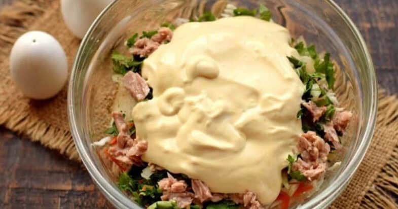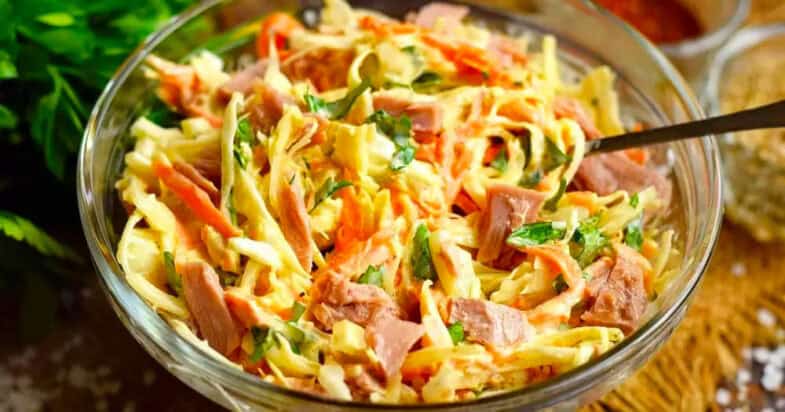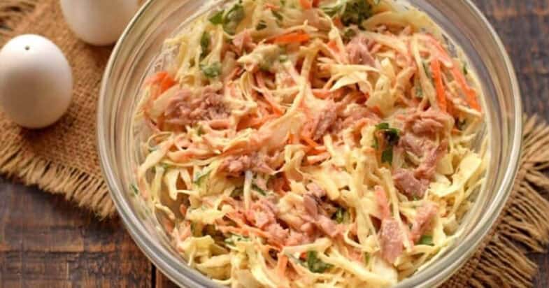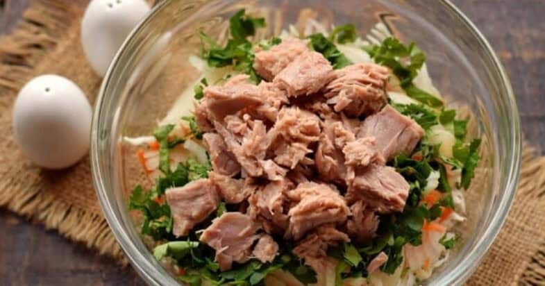 Білокачанну капусту шаткую максимально тонкими смужками. Моркву натираю на тертці. Цибулю нарізаю тонким пір’ям. Петрушку подрібнюю. Консервований тунець дістаю з олії, рибу не мну, смачніше буде, якщо в салаті будуть великі шматочки.
