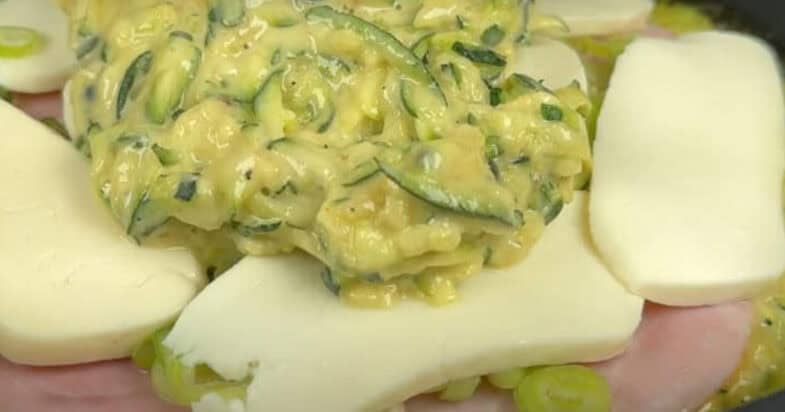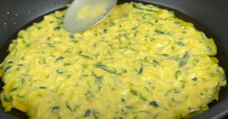 Натираю на терці кабачок, солю і залишаю на 5 хвилин, потім просиджую рідину, яка утворилась, через сито, гарно прижимаючи ложкою. В окремій мисці яйця змішую з сіллю та перцем, вливаю до кабачків, перемішую. Додаю борошно, перемішую. Змащую сковорідку олією, викладаю рівну половину маси, розрівнюю.