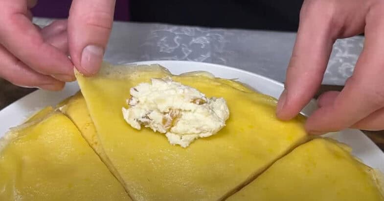 Для начинки сир перетираю в однорідну масу, додаю яйце, цукрову пудру, ваніль, цедру лимона, перемішую. Запарюю родзинки, просушую, додаю до сиру, перемішую. Дрібно нарізаю банани, перемішую. Млинці розрізаю на 4 трикутники, викладаю начинку та закручую рулетами.
