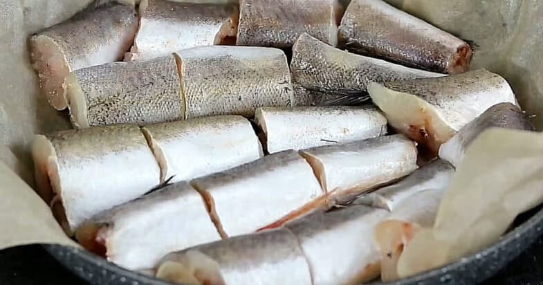 Хек нарізаю шматочками, сковорідку застеляю пергаментом та змащую олію. Викладаю рибу, накриваю пергаментом і кришкою, тушкую 15 хвилин на маленькому вогні. Потім відділяю філе від кісточок.